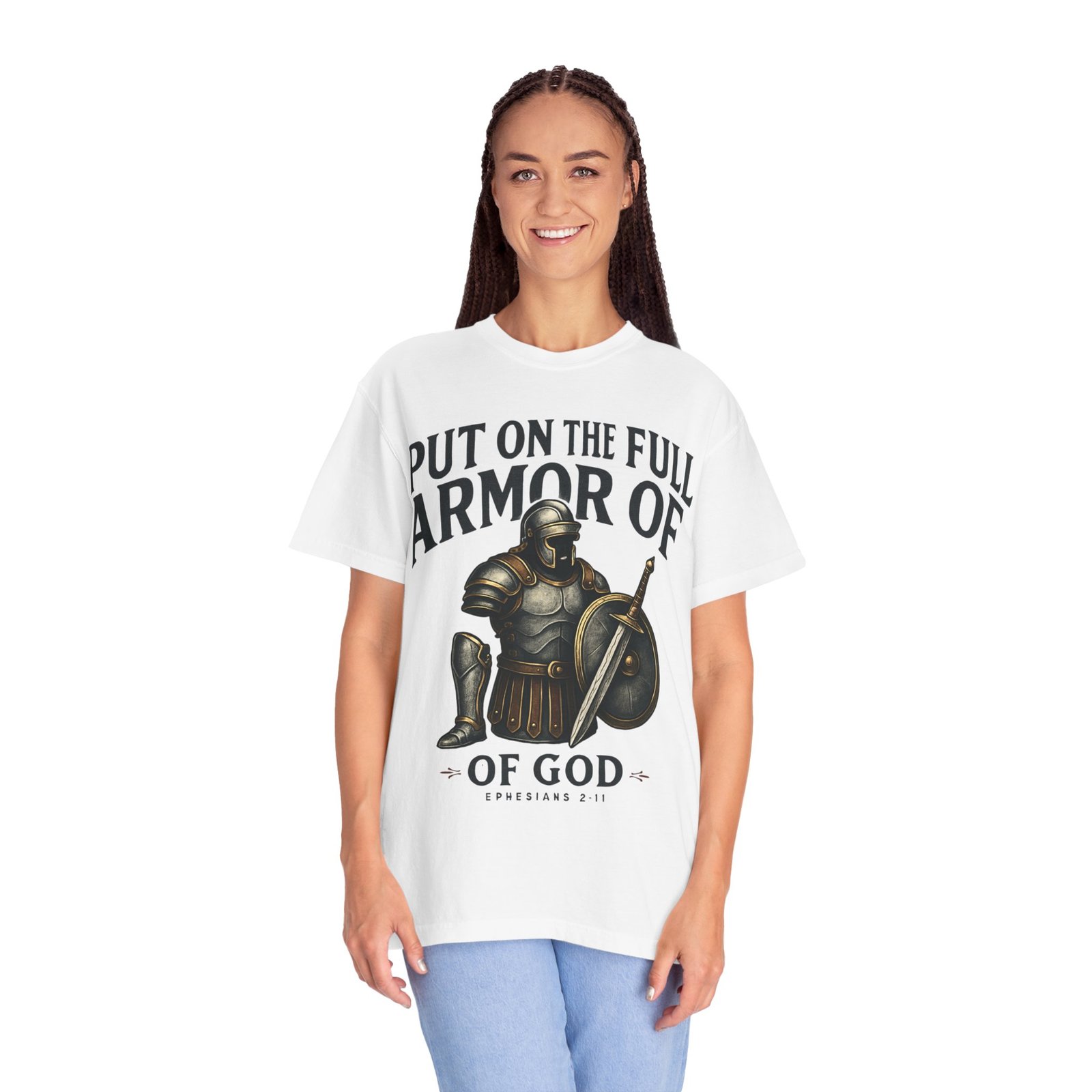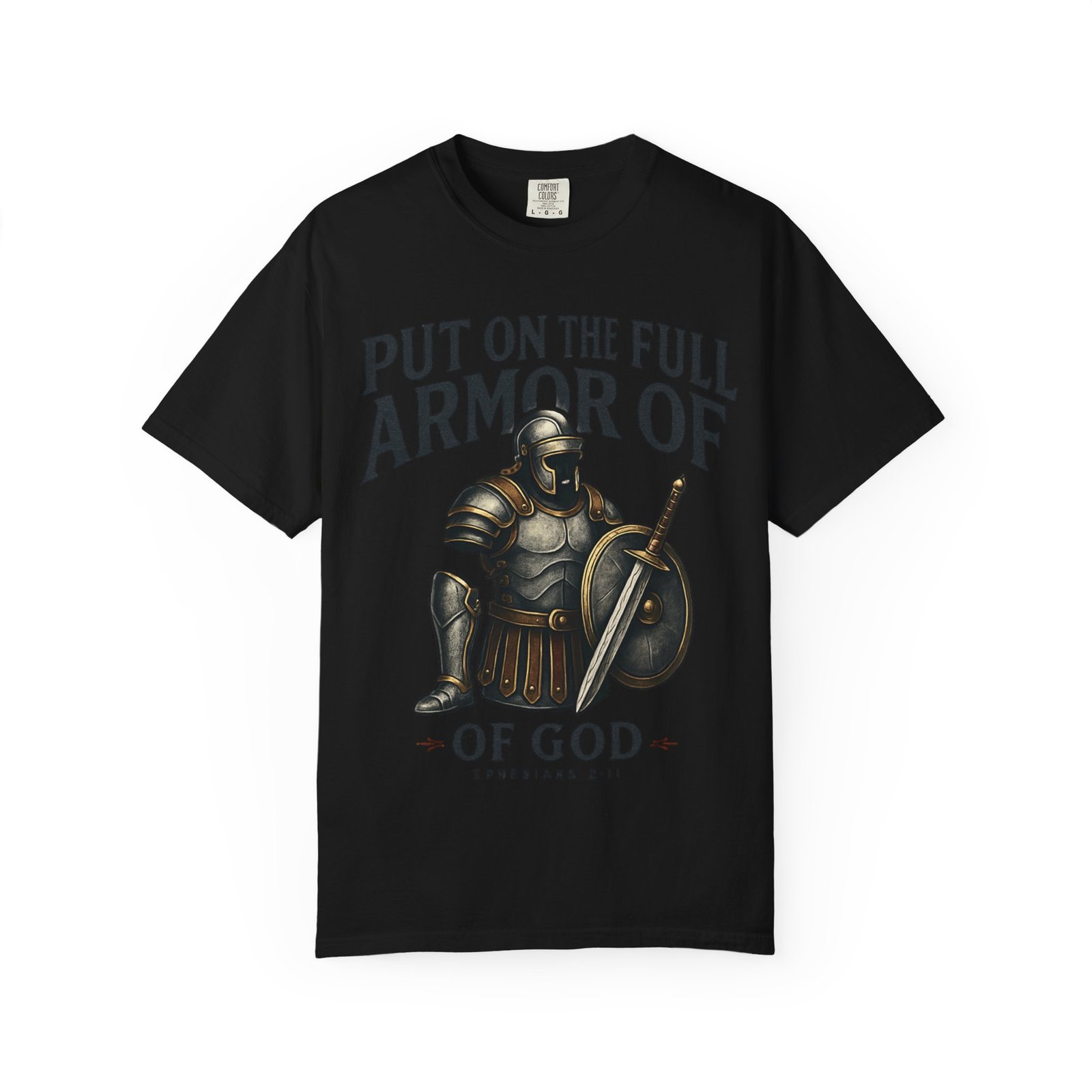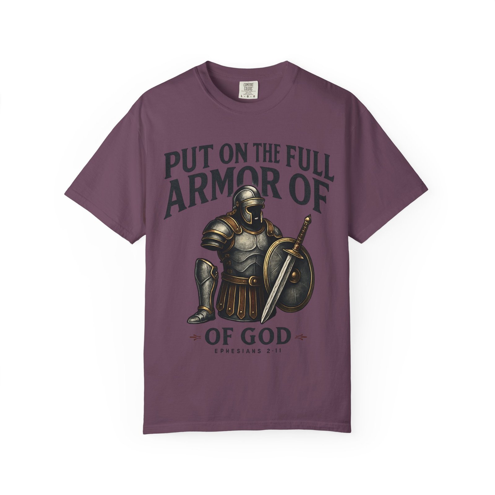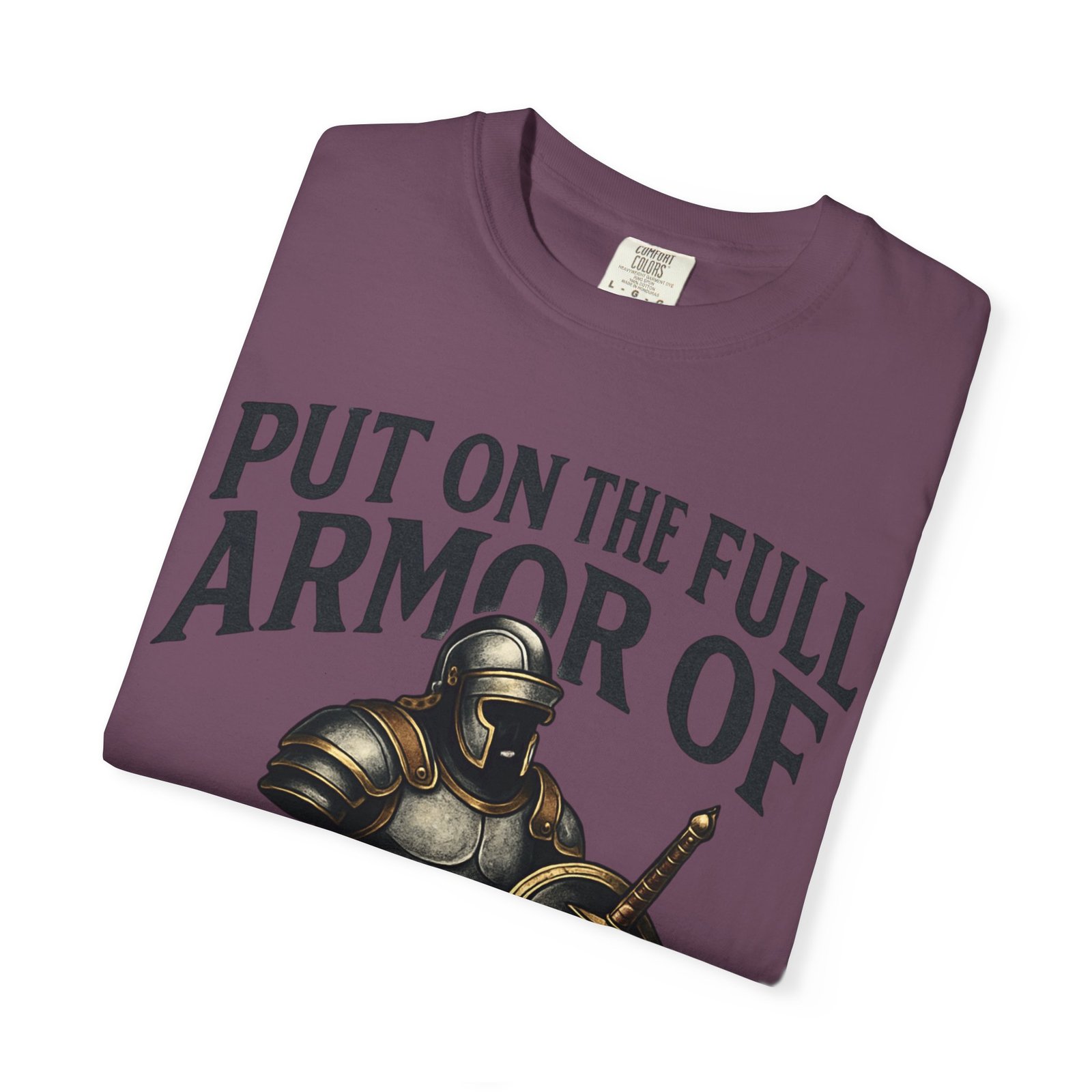This garment-dyed tee carries quiet strength. A hand-drawn suit of armor rests at center, shield and sword catching soft highlights, while the phrase “Put on the full armor of God” frames it in a confident, reverent arc. The cotton has a lived-in softness from the garment-dye process; the relaxed fit and medium-weight fabric let it layer easily over hoodies or stand alone during warm-weather outreach. Wear it to church pickup, mission days, small-group meetups, or while volunteering — it reads like a statement of faith without shouting, a companion shirt that moves with you through everyday service and Sundays alike.