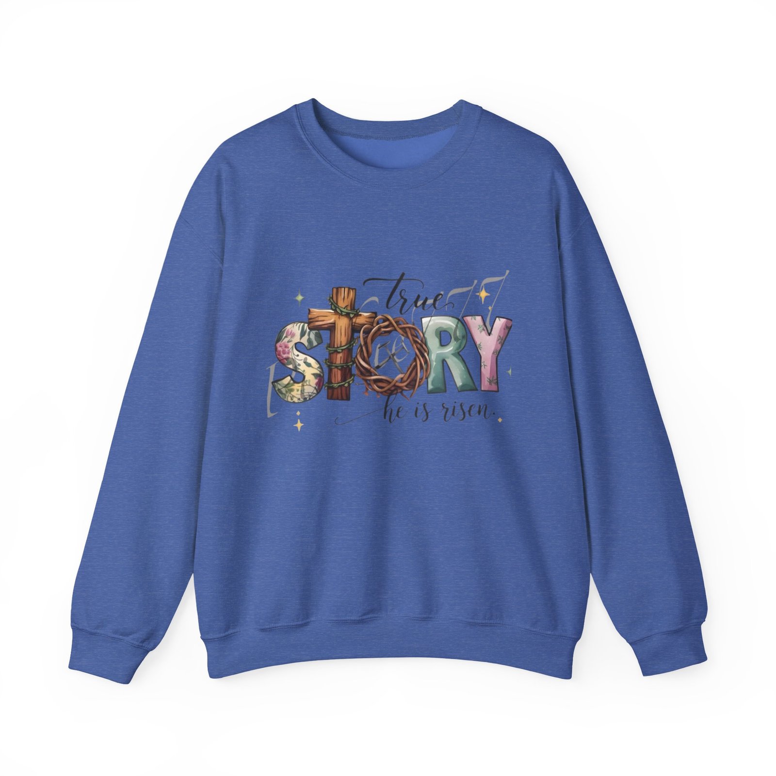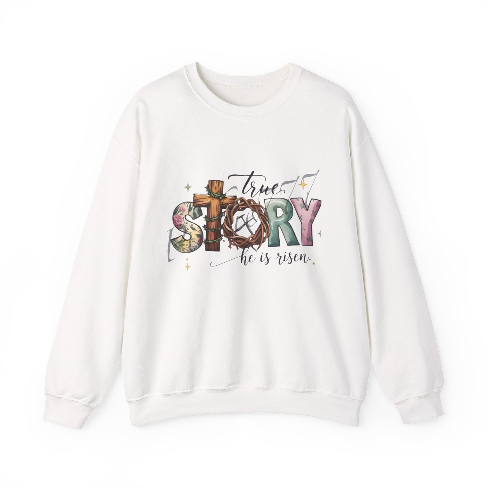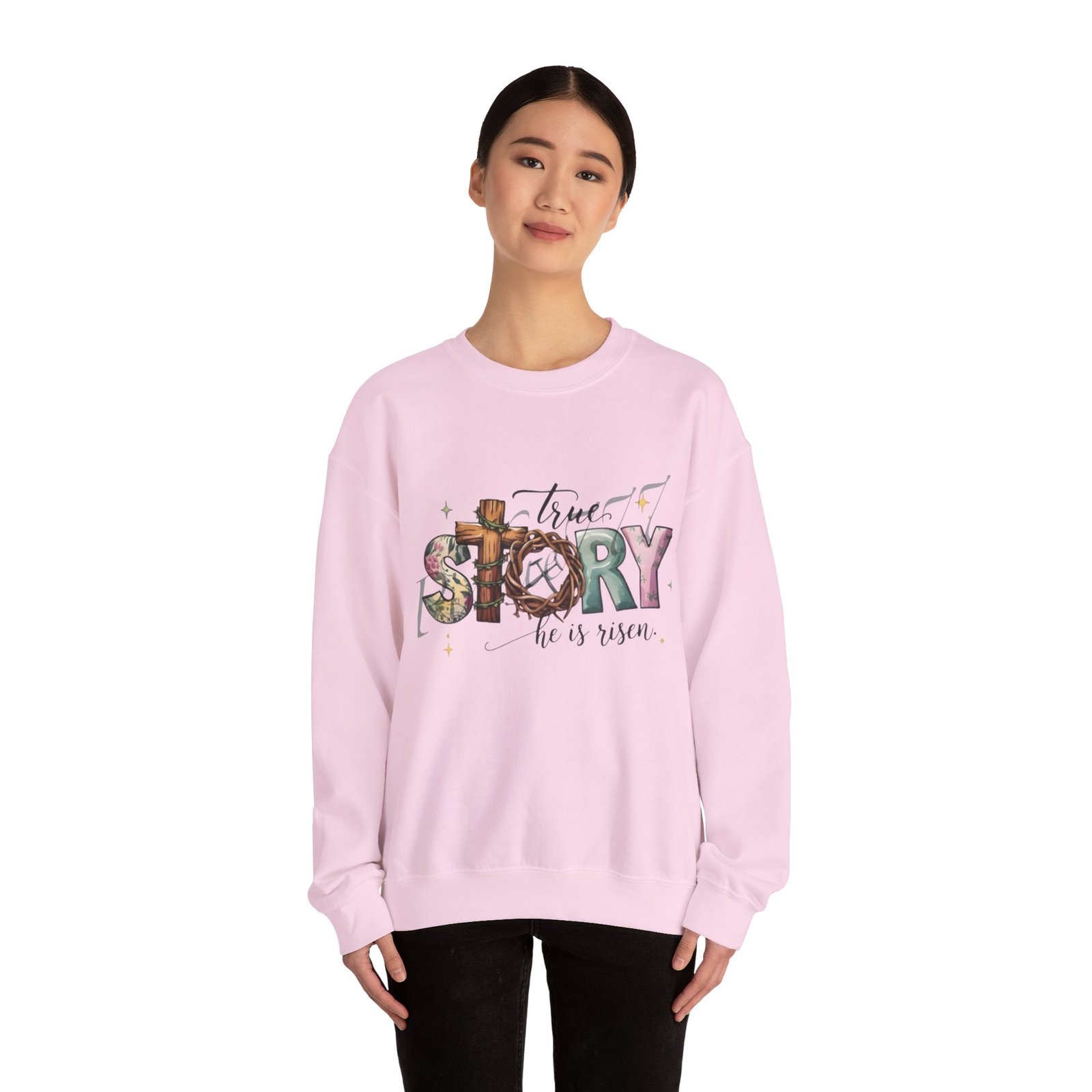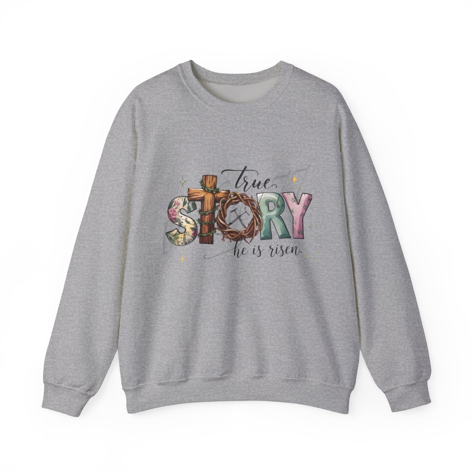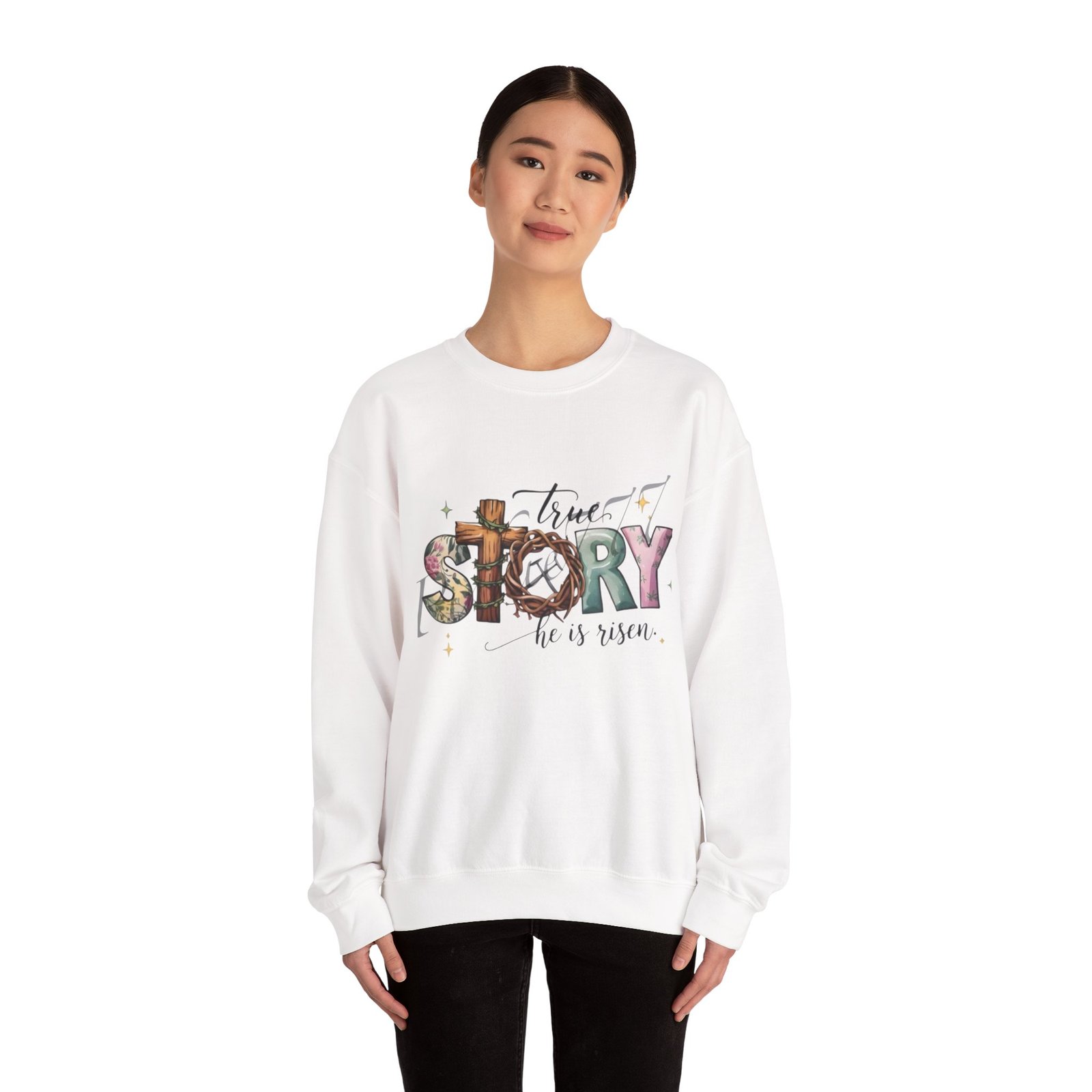 Crewneck Sweatshirt — 'True Story He Is Risen' Easter Cross Christian DesignCrewneck Sweatshirt — ‘True Story He Is Risen’ Easter Cross Christian Design