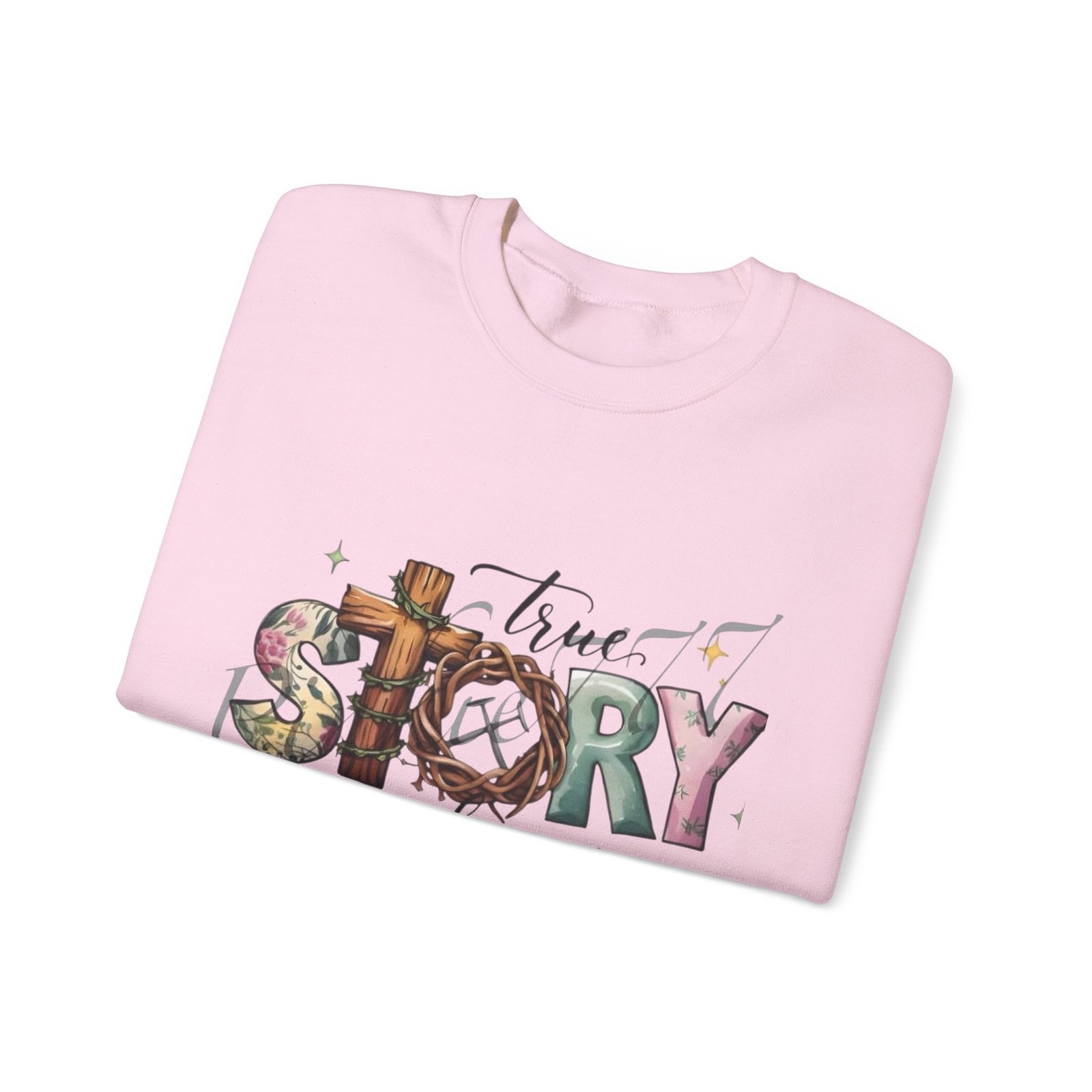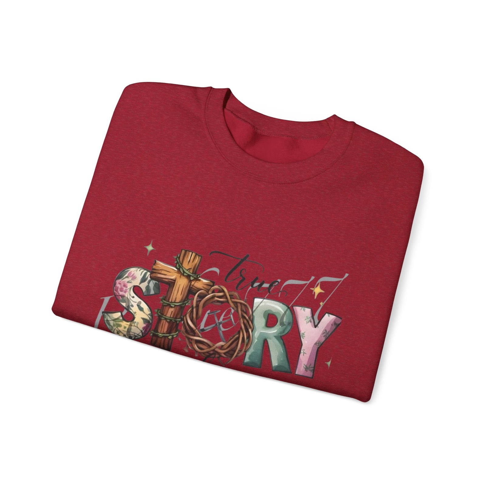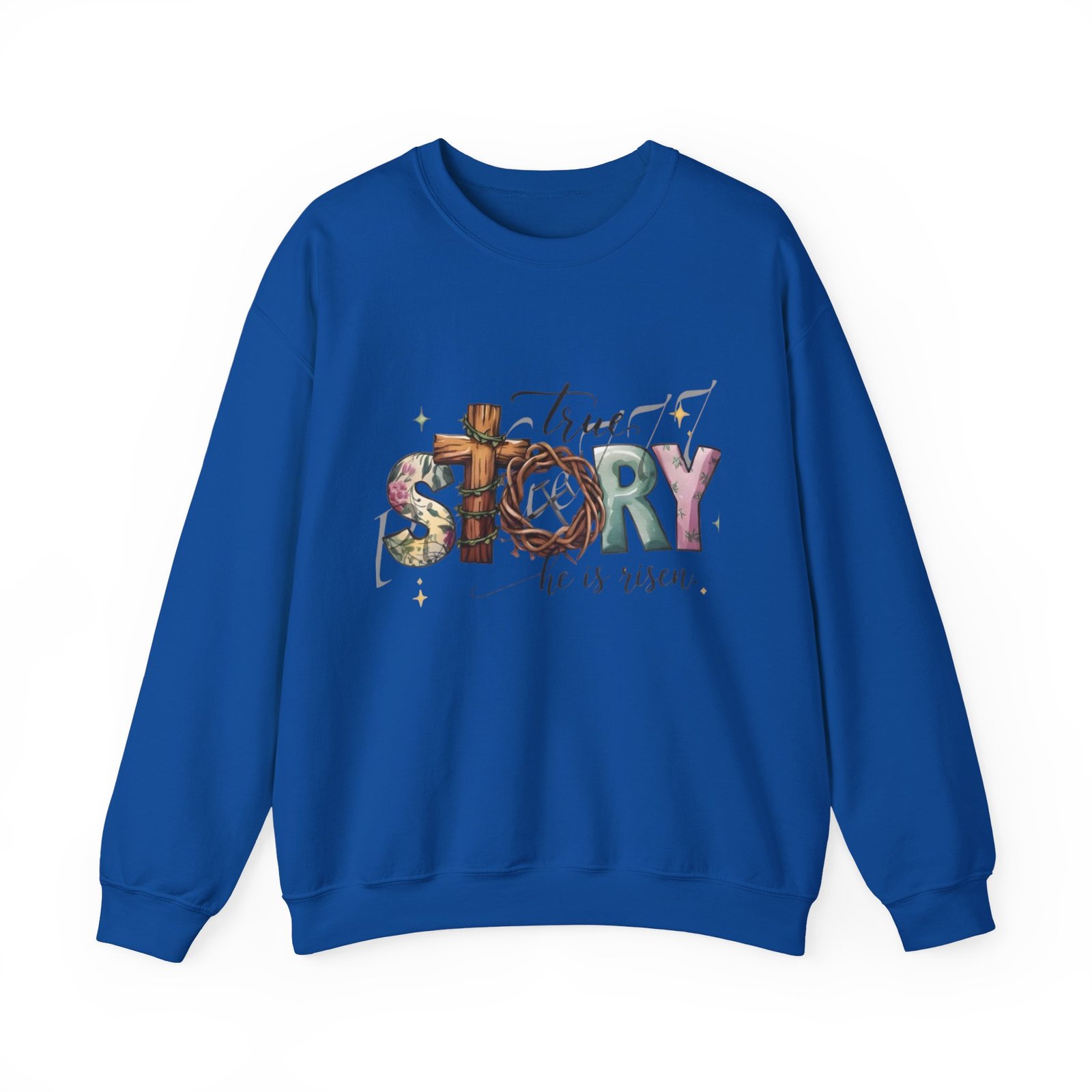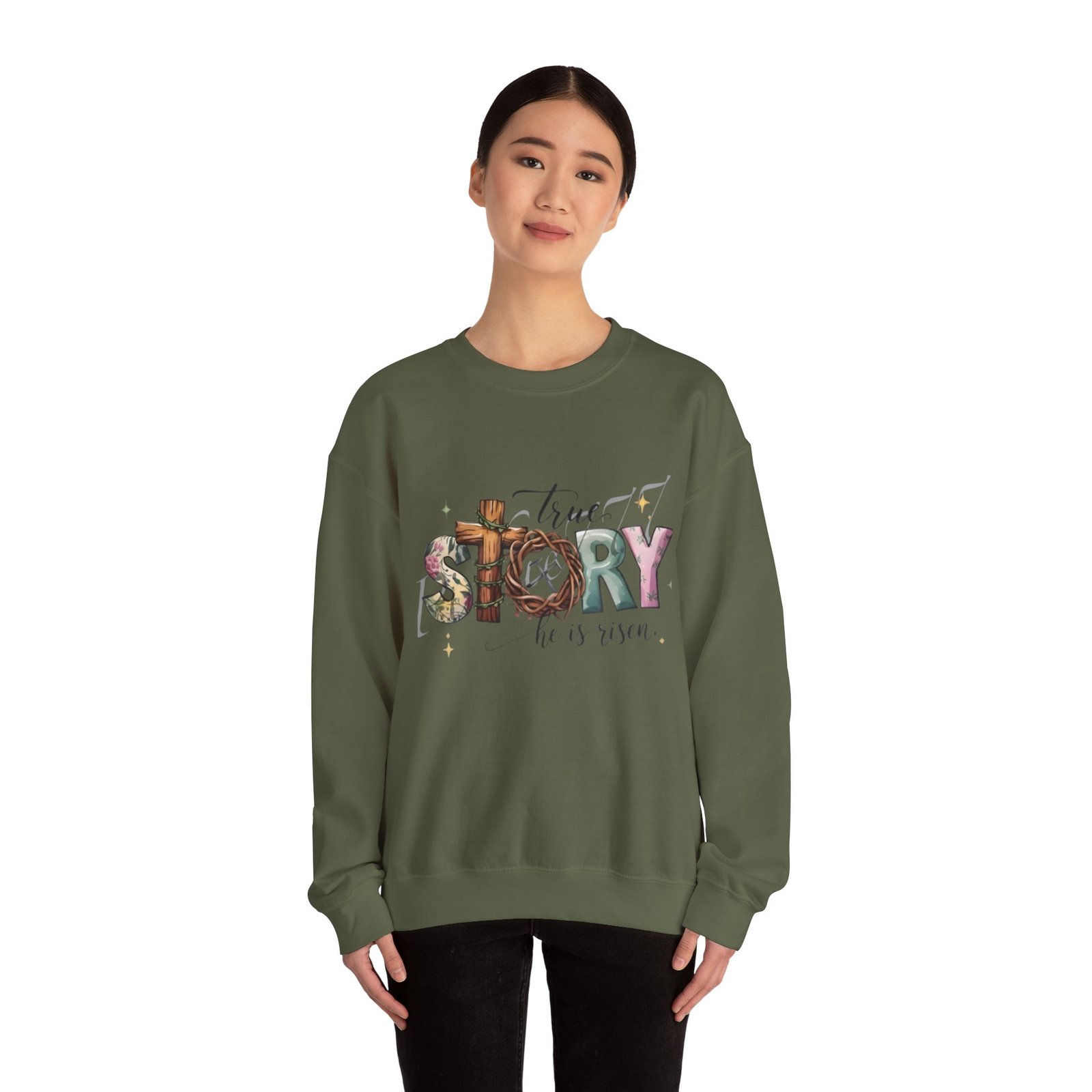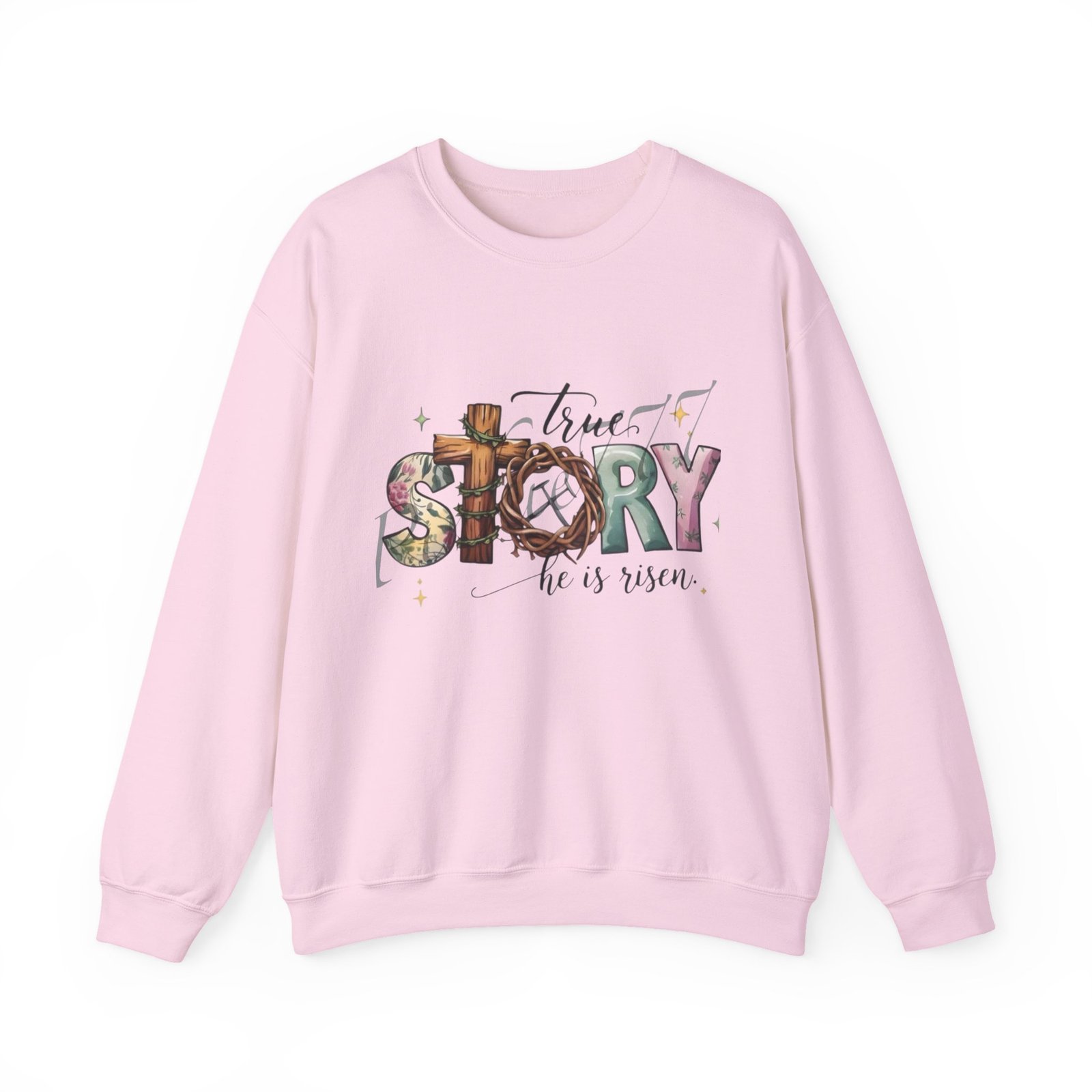 Crewneck Sweatshirt — 'True Story He Is Risen' Easter Cross Christian DesignCrewneck Sweatshirt — ‘True Story He Is Risen’ Easter Cross Christian Design