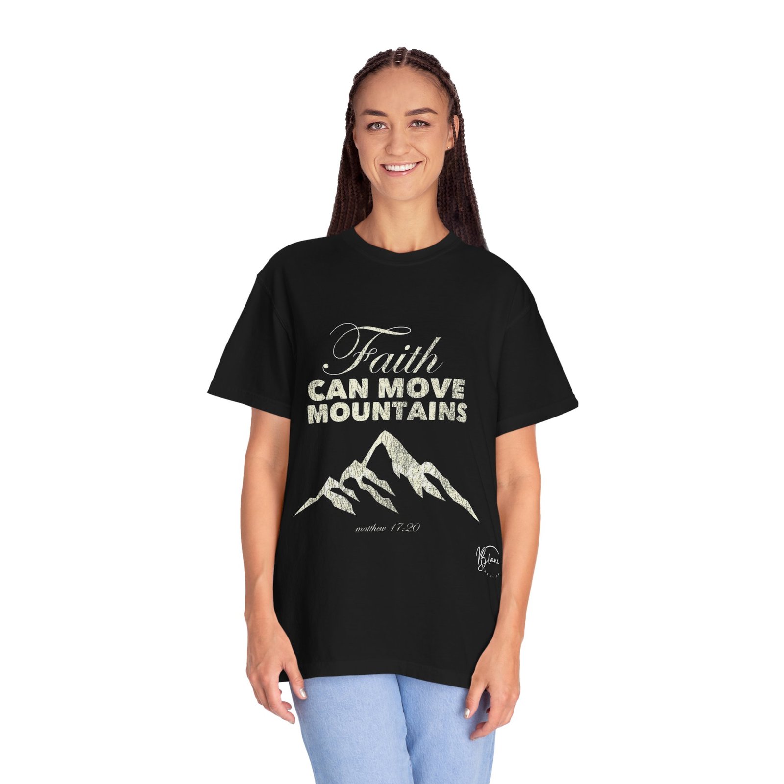A softly garment-dyed cotton tee with a gentle, hand-drawn mountain graphic and the uplifting phrase “Faith Can Move Mountains.” The relaxed fit and medium-weight, ring-spun cotton drape easily over layers or stand alone on warm days. Subtle distressing in the print and the garment-dye finish give the shirt a worn-in, lived-with feel that settles into your routine — whether you’re headed out for a sunrise hike, packing light for a cabin weekend, or wearing it to a Sunday morning gathering. It reads like a quiet reminder: steady faith, slow strength. The sewn-in label and clean back make it simple and versatile for everyday wear.