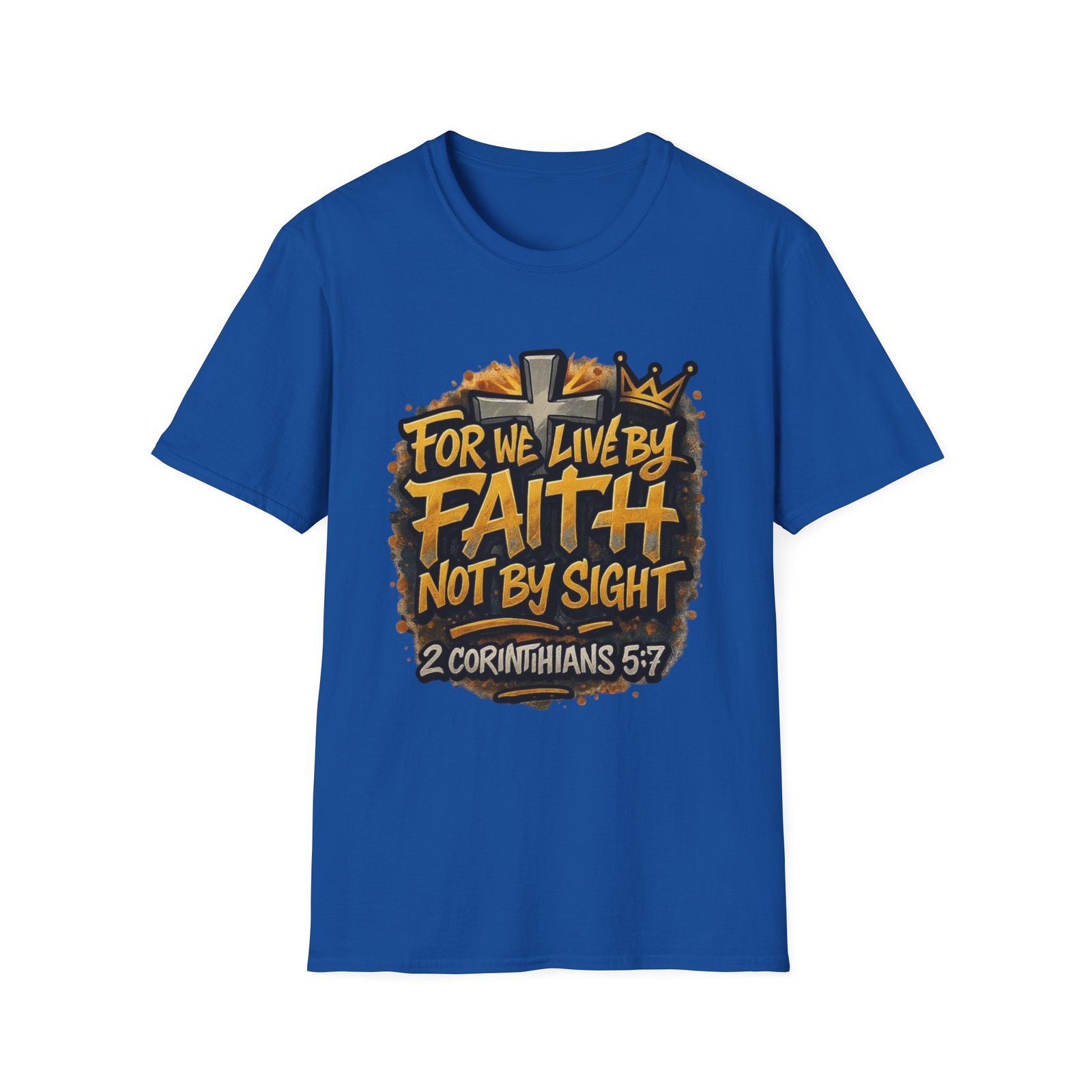 A lightweight, breathable tee that carries a bold message: “For we live by faith, not by sight” (2 Corinthians 5:7). The front features an expressive, hand-lettered design in warm gold and deep brown tones, framed by a subtle crown and cross motif that feels both modern and reverent. The classic crew neck and clean silhouette make it easy to layer under a jacket or wear on its own during church gatherings, volunteer days, or casual meetups. It’s made to move with you—soft to the touch, durable for repeated wear, and finished with a tear-away label so nothing distracts from the message on your chest.