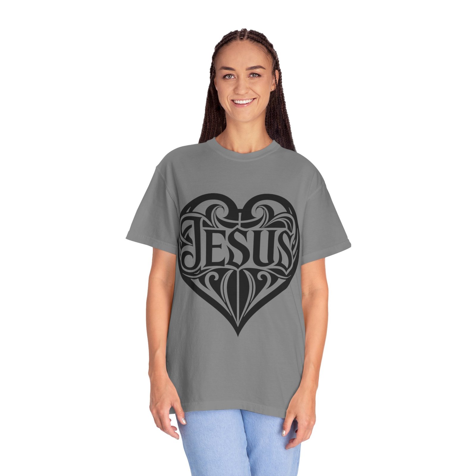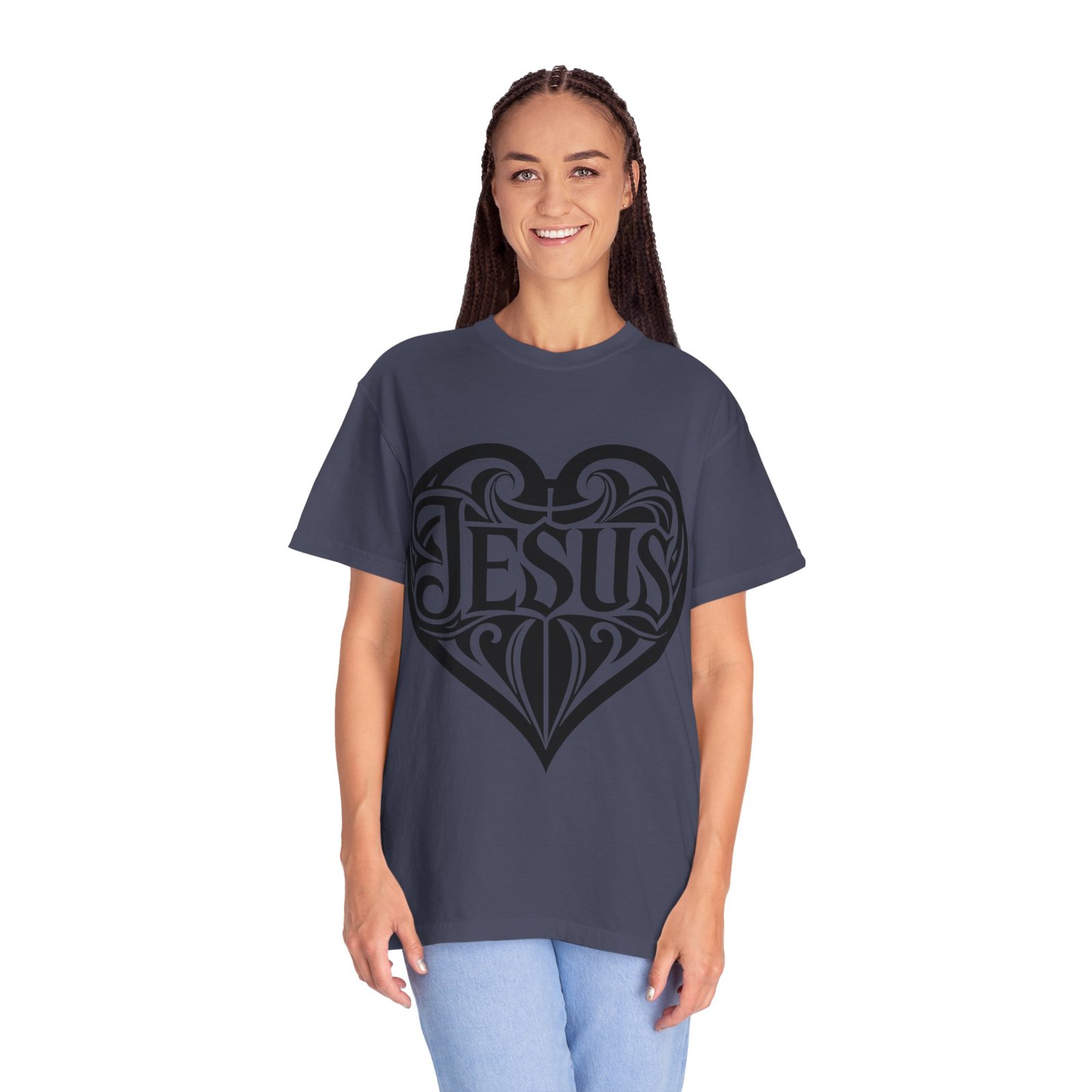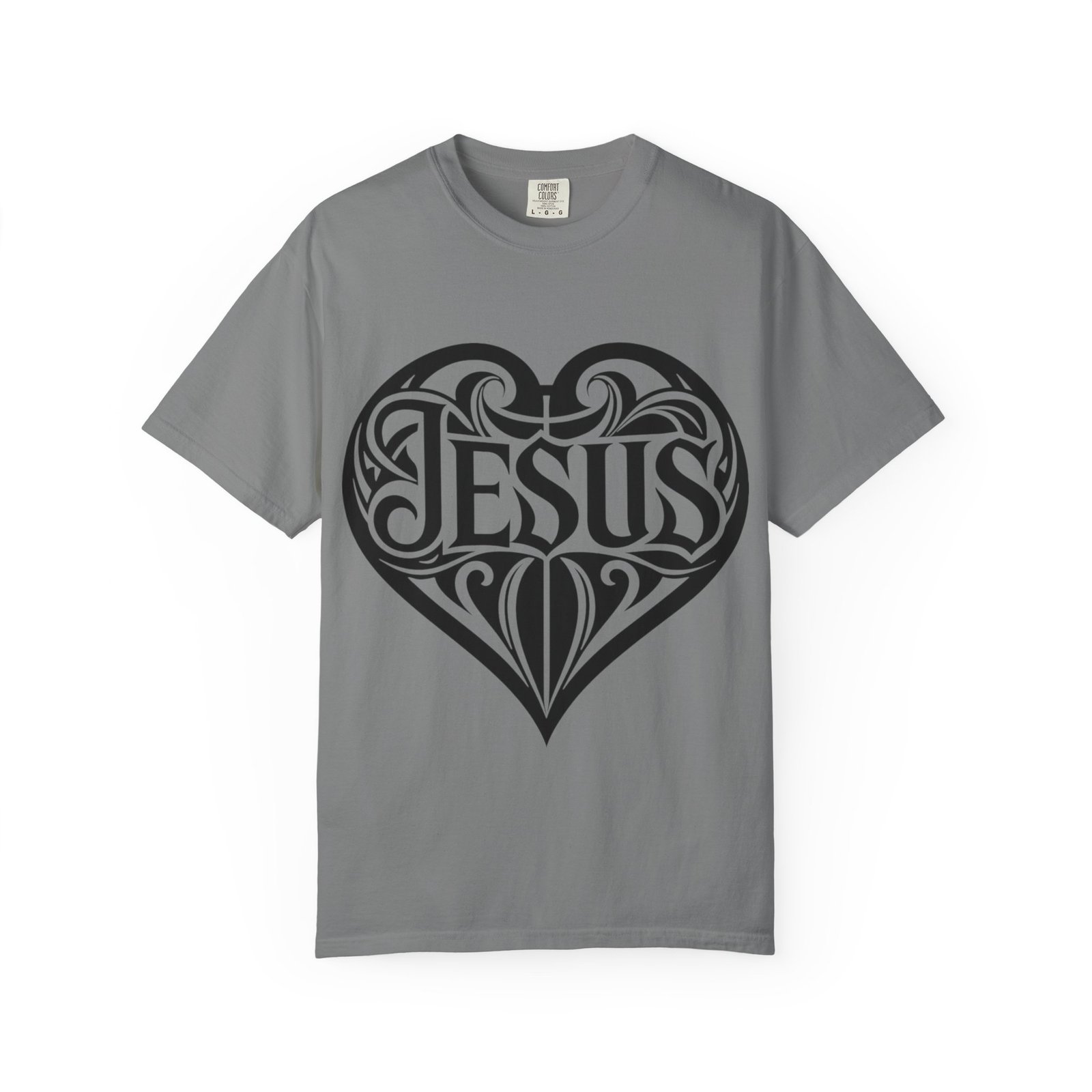 A soft, garment-dyed tee printed with a bold heart-shaped Jesus motif that blends classic faith and modern street-art style. The relaxed, midweight cotton drapes easily over layers or stands out on its own. Wear it to express quiet devotion or as a conversation-starting piece at church events, mission trips, or casual weekend gatherings. The inked heart design reads from across the room yet stays tasteful and wearable — an everyday reminder of faith shaped into art.