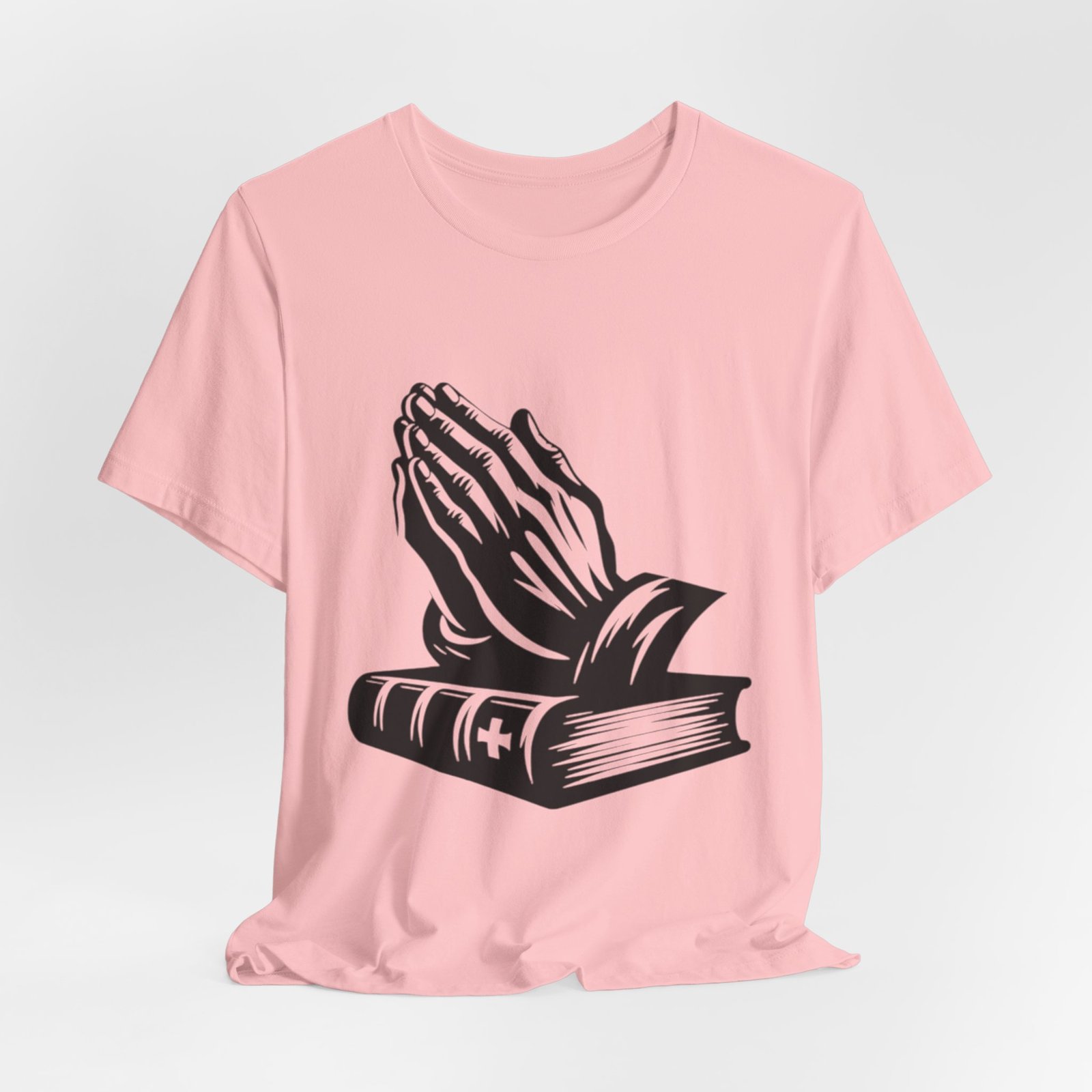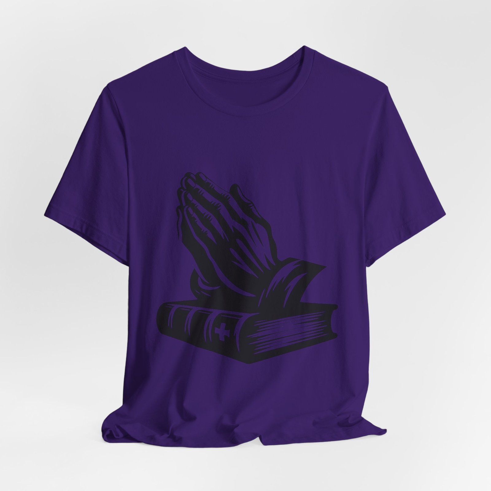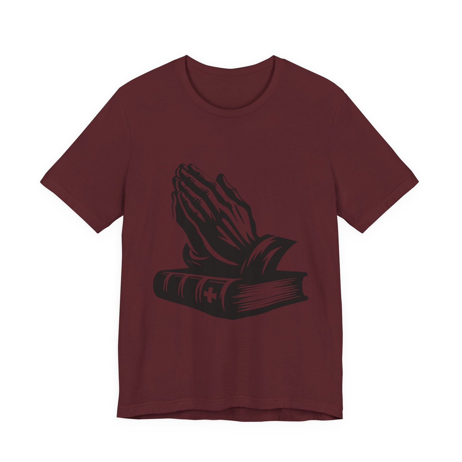 Soft, breathable cotton meets a timeless symbol of faith. This lightweight short-sleeve tee carries a bold monochrome illustration of hands folded over a Bible — simple, reverent, and graphic. It layers easily under jackets or stands alone on warm days. Wear it to small group gatherings, church volunteer days, or quiet mornings with coffee and scripture. The neat crew neckline and retail fit give it a composed look that feels intentional without being formal. Sustainably made and comfortable enough for daily wear, it’s a straightforward way to express devotion in everyday life.