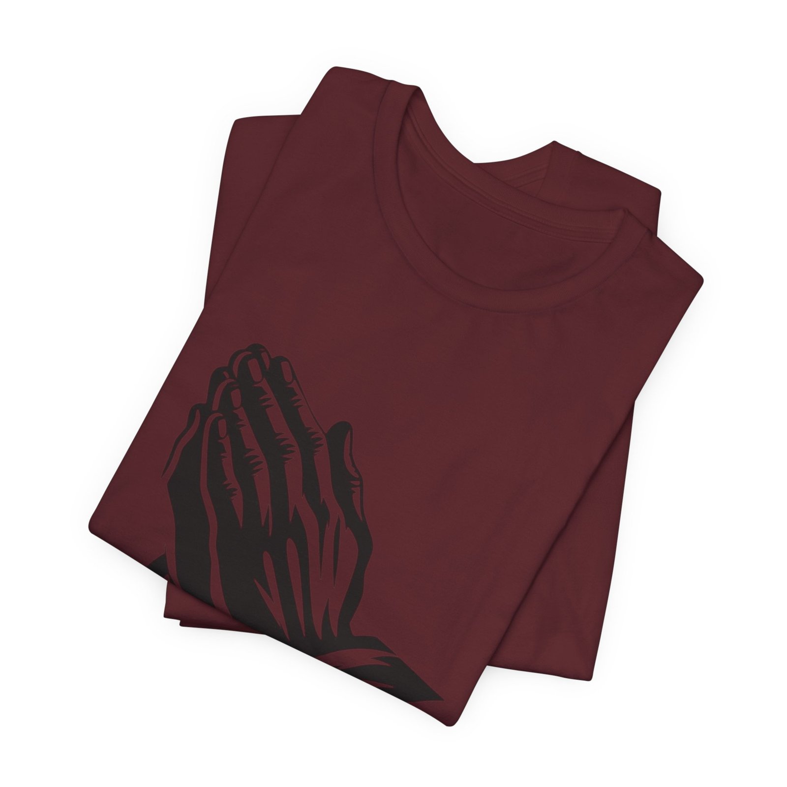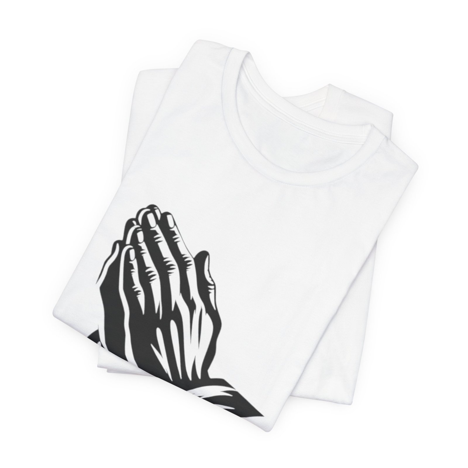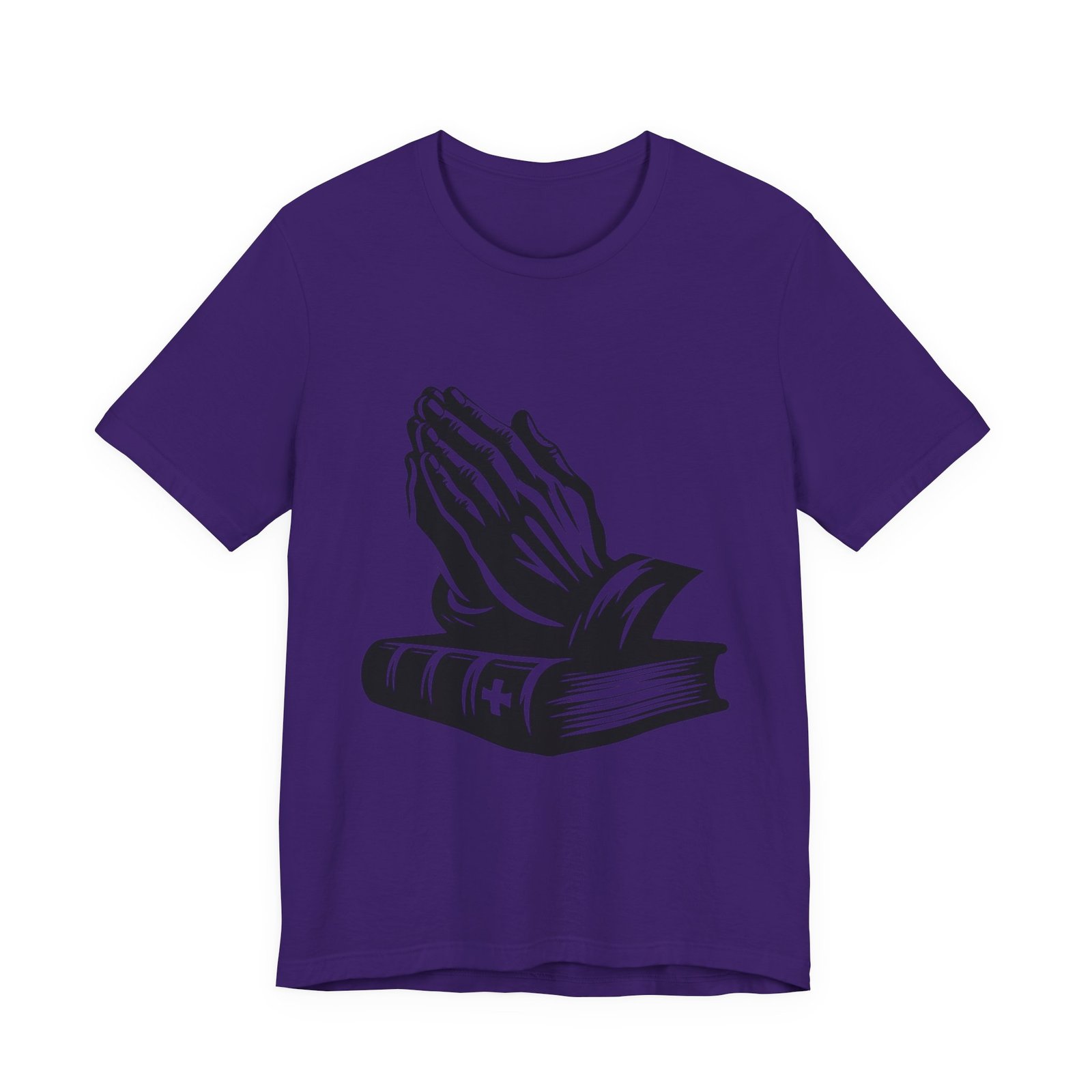 Soft, breathable cotton meets a timeless symbol of faith. This lightweight short-sleeve tee carries a bold monochrome illustration of hands folded over a Bible — simple, reverent, and graphic. It layers easily under jackets or stands alone on warm days. Wear it to small group gatherings, church volunteer days, or quiet mornings with coffee and scripture. The neat crew neckline and retail fit give it a composed look that feels intentional without being formal. Sustainably made and comfortable enough for daily wear, it’s a straightforward way to express devotion in everyday life.