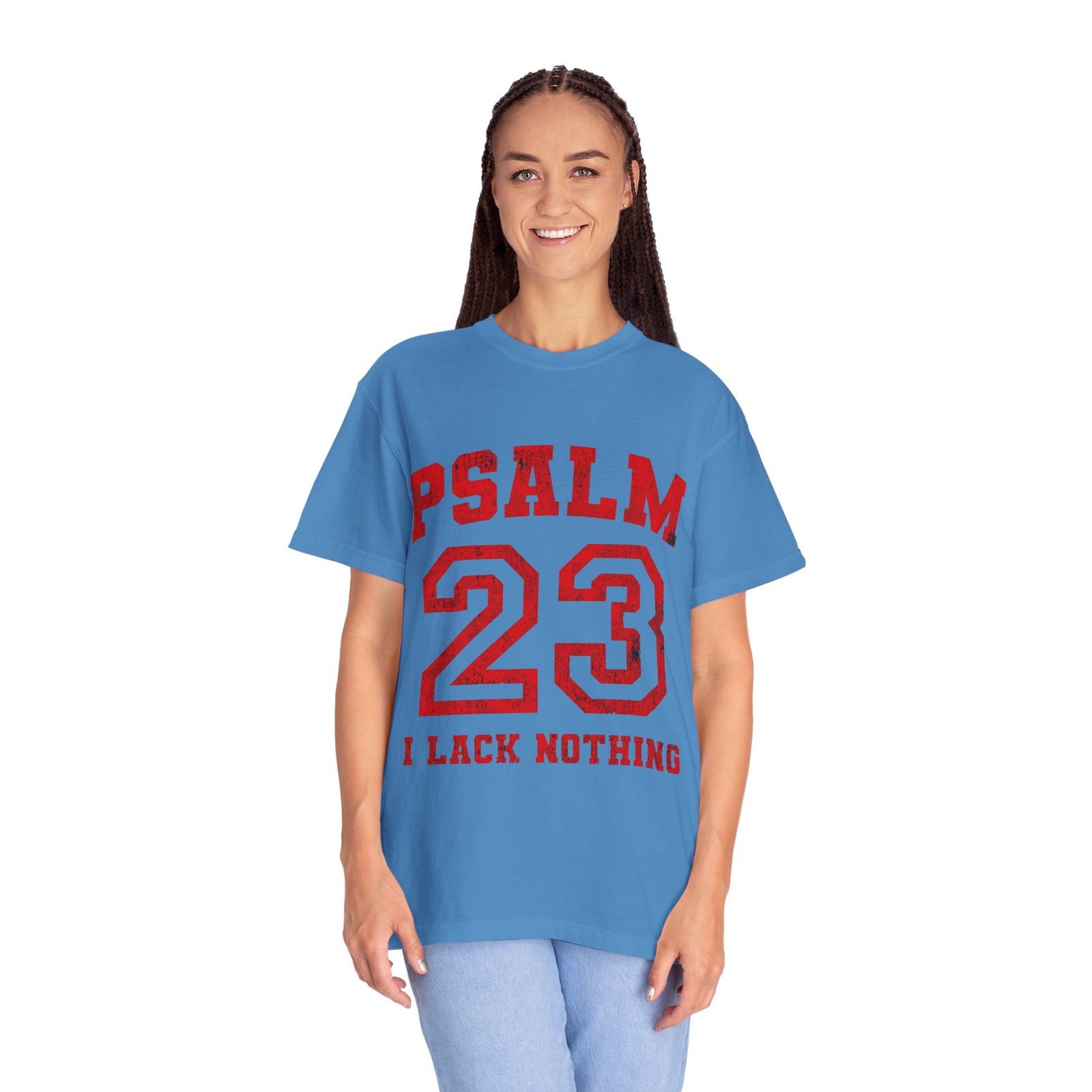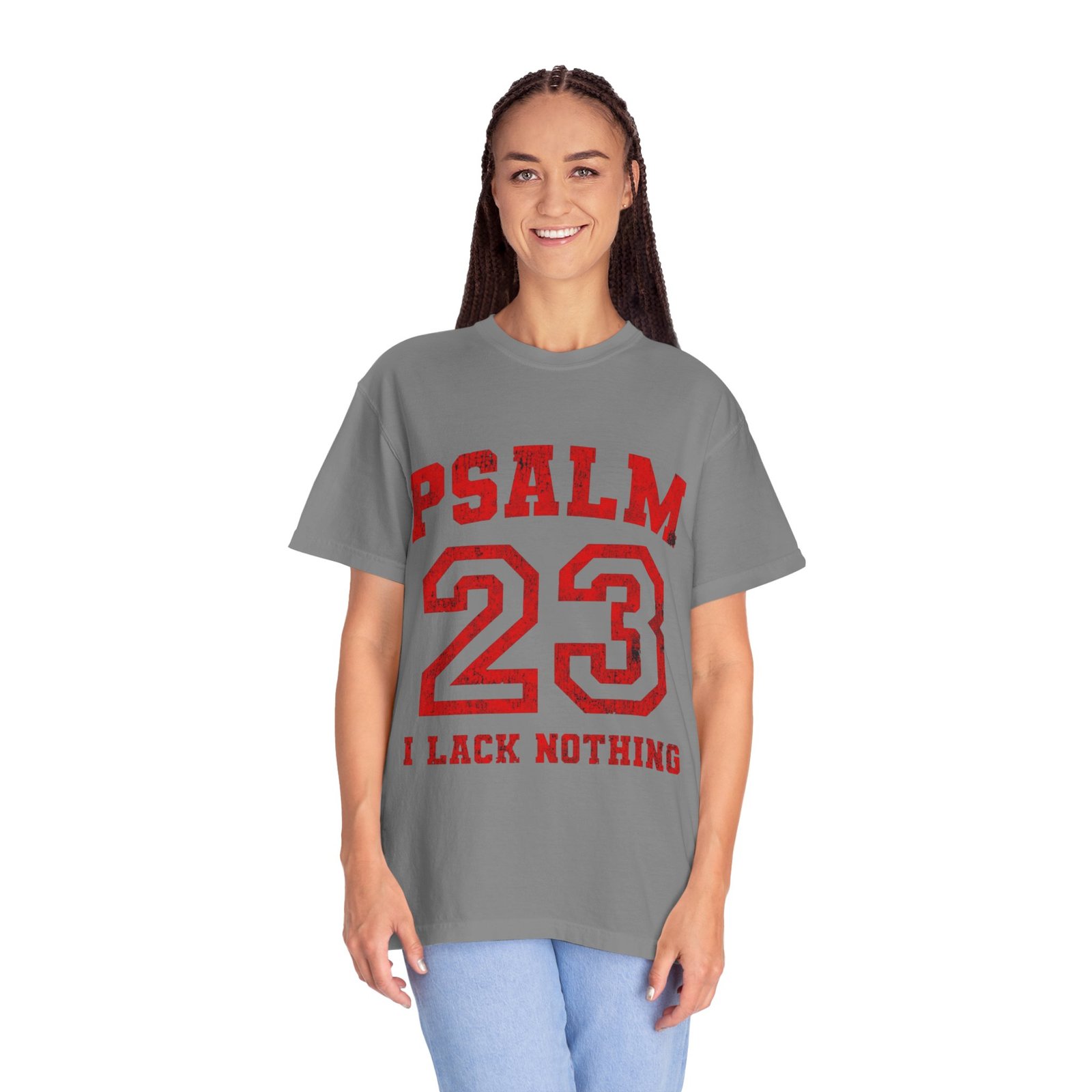 This relaxed-fit garment-dyed tee carries a quiet, confident faith—bold block letters spell PSALM with a collegiate-style 23 across the chest and the simple declaration “I LACK NOTHING” beneath. The soft, pre-shrunk 100% ring-spun cotton and medium-weight fabric feel lived-in from the first wear. Tubular knit construction and double-needle stitching give it a clean silhouette and reliable durability. Wear it to church youth nights, weekend coffee runs, or moments when you want to speak faith without saying a word—the muted dye and classic athletic type keep the look approachable and honest.