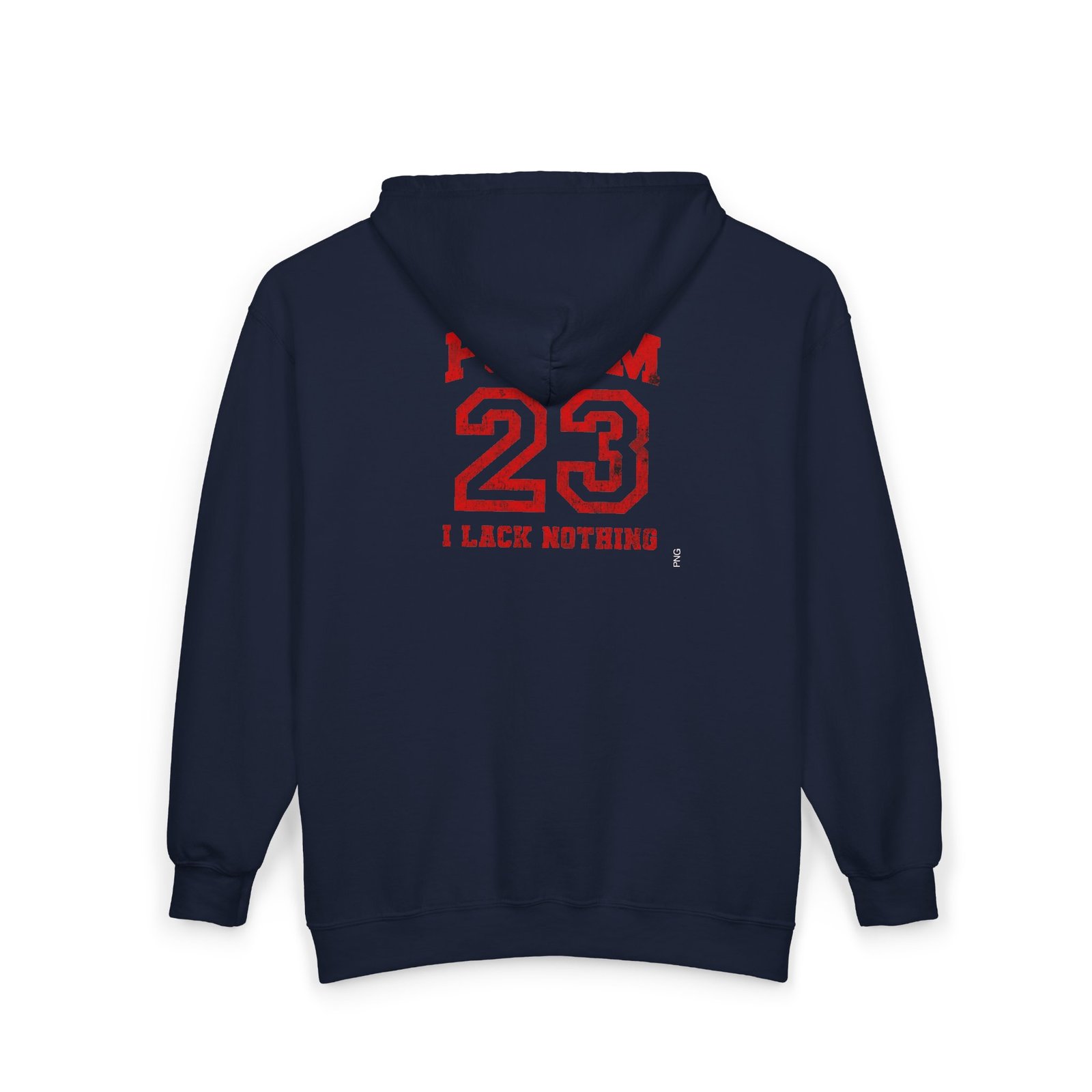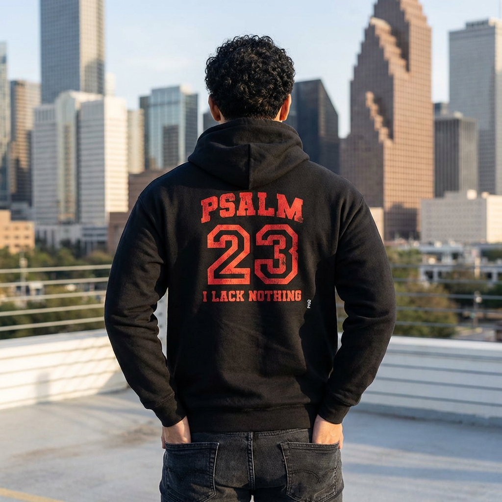 This classic full-zip hoodie blends dependable everyday wear with quiet faith-forward design. The medium-heavy 50/50 cotton-poly fabric feels substantial without being stiff, and the tubular knit construction keeps the silhouette clean. A roomy hood with drawstring and deep front pockets hold hands, keys, or a small Bible. On the back, bold red varsity-style lettering reads “PSALM 23” with a distressed athletic feel — it reads like a team emblem for those who find courage in that Psalm. The metal zipper and optional left-chest embroidery add lasting detail, while DTF wrist prints and DTG body printing keep the graphic crisp. It wears true to size and comes with an EU two-year warranty, so you can reach for it on quiet mornings, weekend runs to church, or long evenings of prayer and reflection.