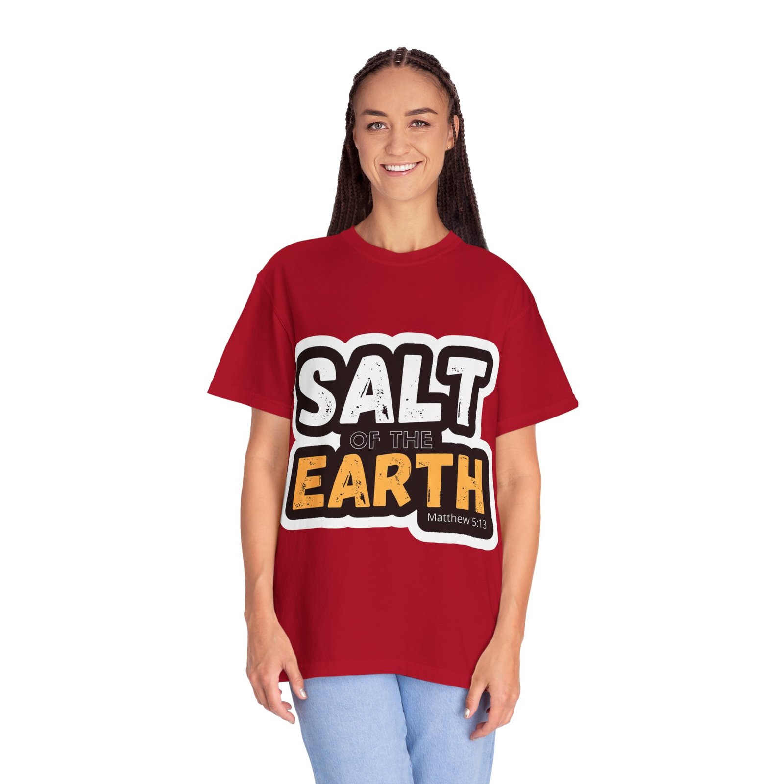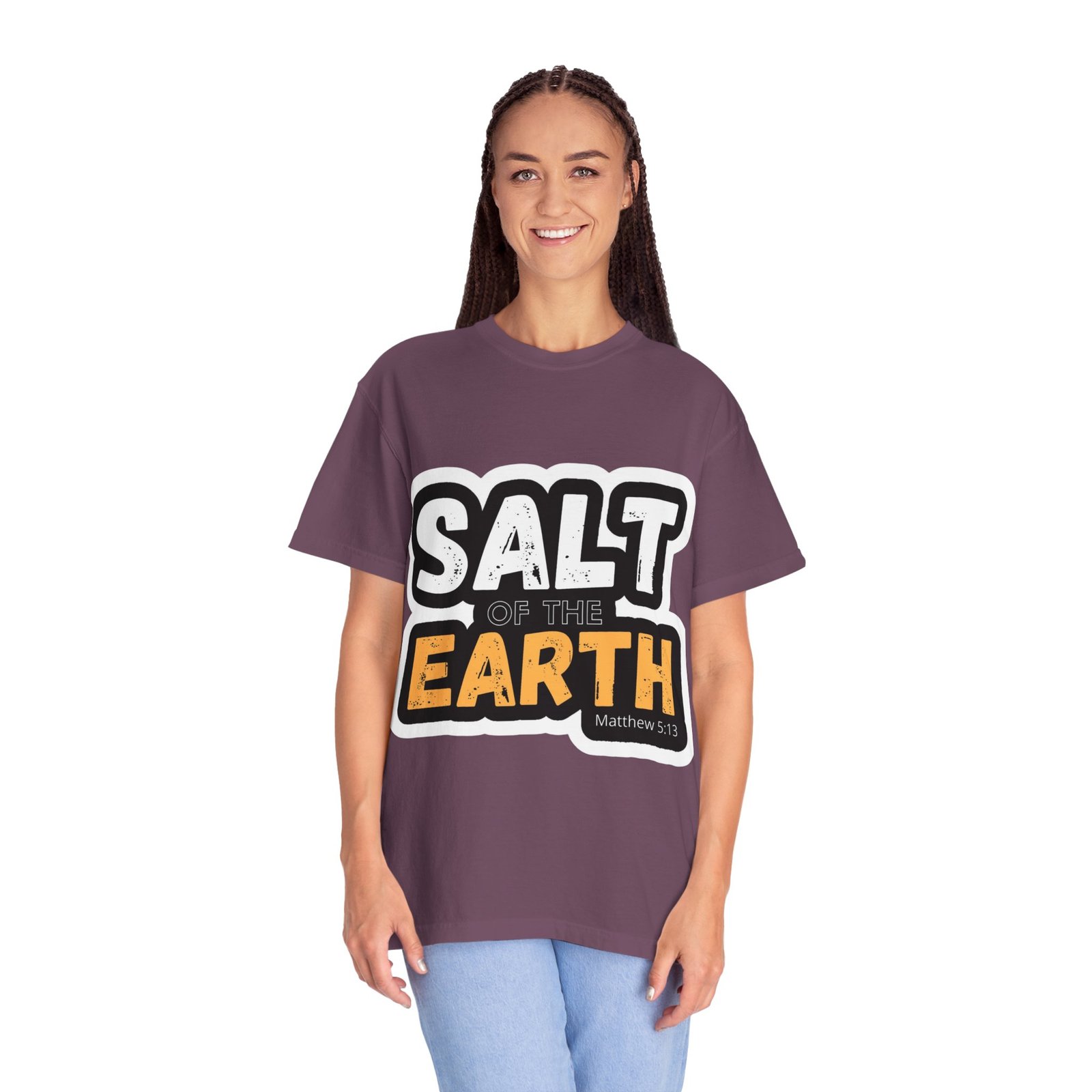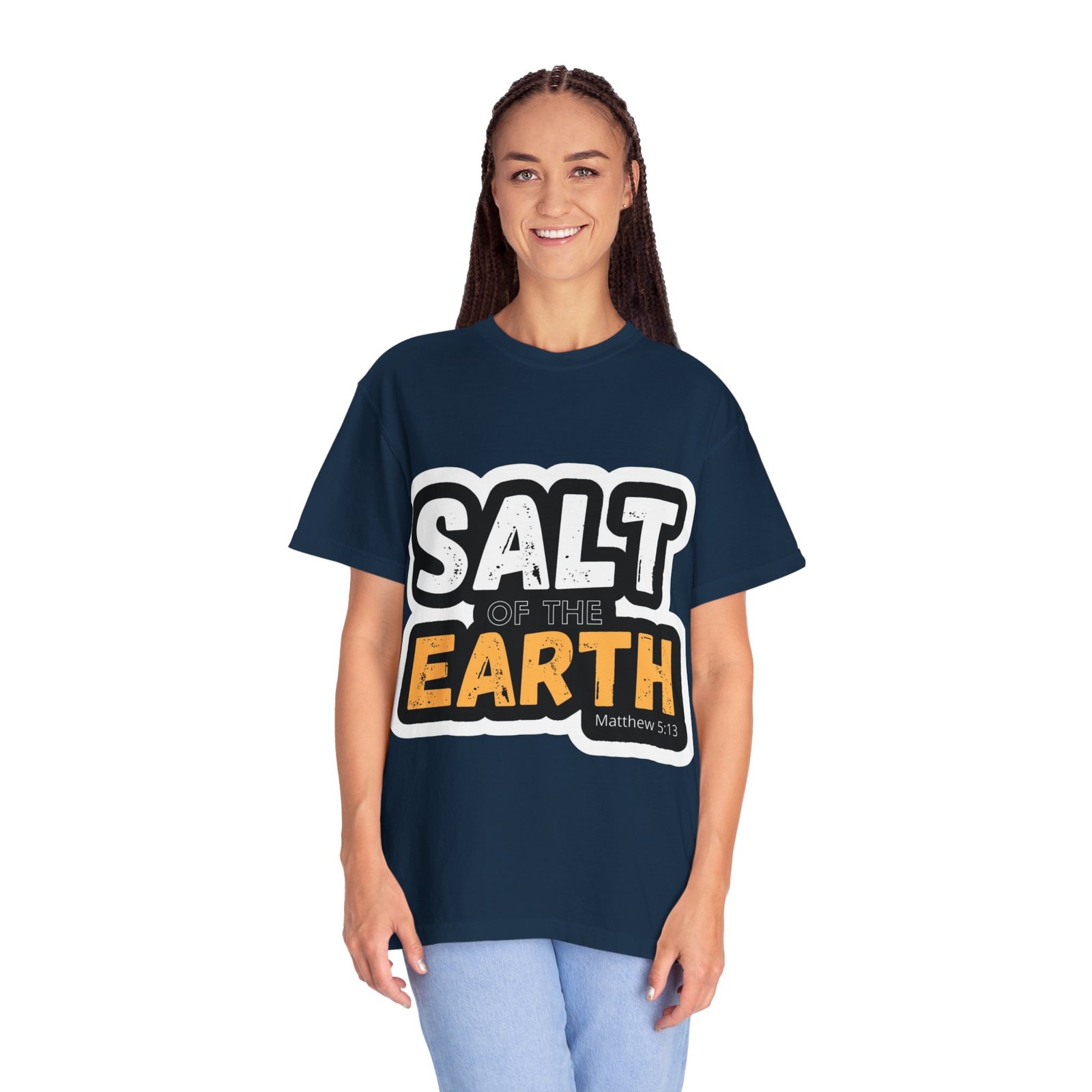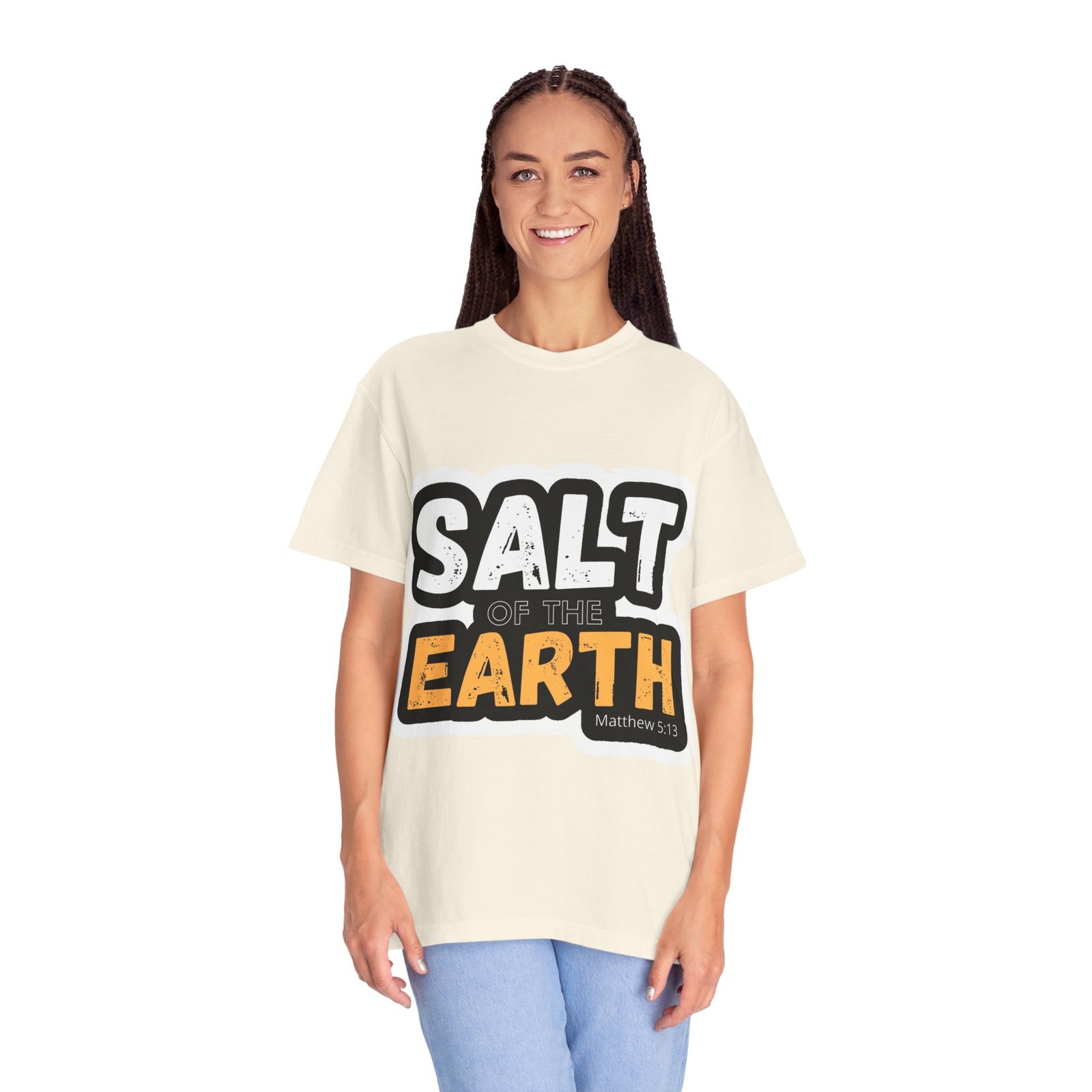 This garment-dyed tee reads like a small declaration you can wear. Bold, slightly distressed lettering spells “SALT OF THE EARTH” with a pop of warm amber on “EARTH,” giving the design a rugged, earnest feel. The relaxed, midweight cotton drapes comfortably through long days of service, volunteering, or casual meetups. It pairs naturally with worn jeans, work boots, or layered under a flannel for cooler mornings — a quietly confident shirt for people who value substance over show. The soft, broken-in color and sewn-in label add a lived-in comfort that invites repeated wear and stories.